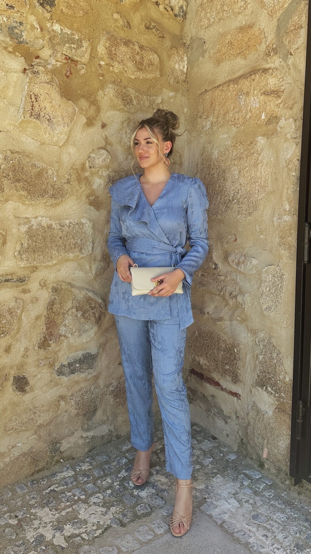 Traje de chaqueta que se destaca por su original volante asimètrico, un detalle femenino que aporta personalidad al conjunto, sin renunciar a la comodidad para ocasiones especiales.